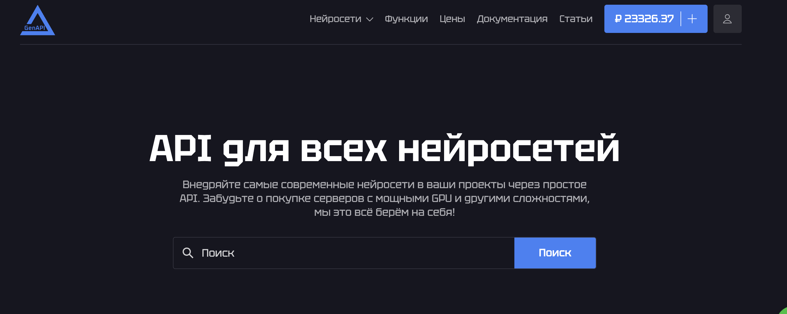 Для начала следует открыть главную страницу сайта Gen-Api.ru, после чего выбрать в меню сверху раздел нейросети.
