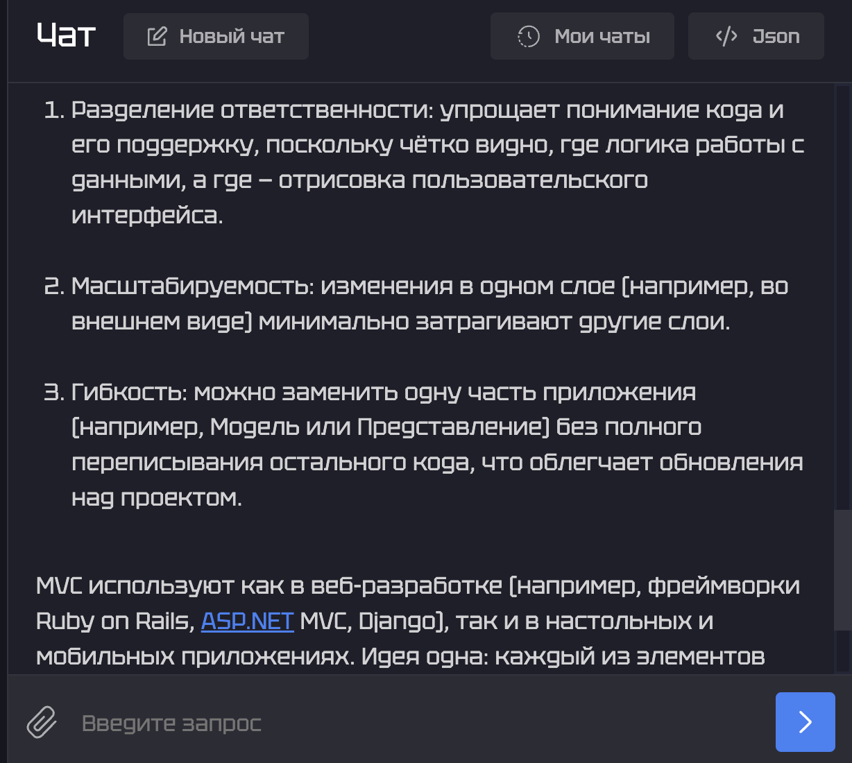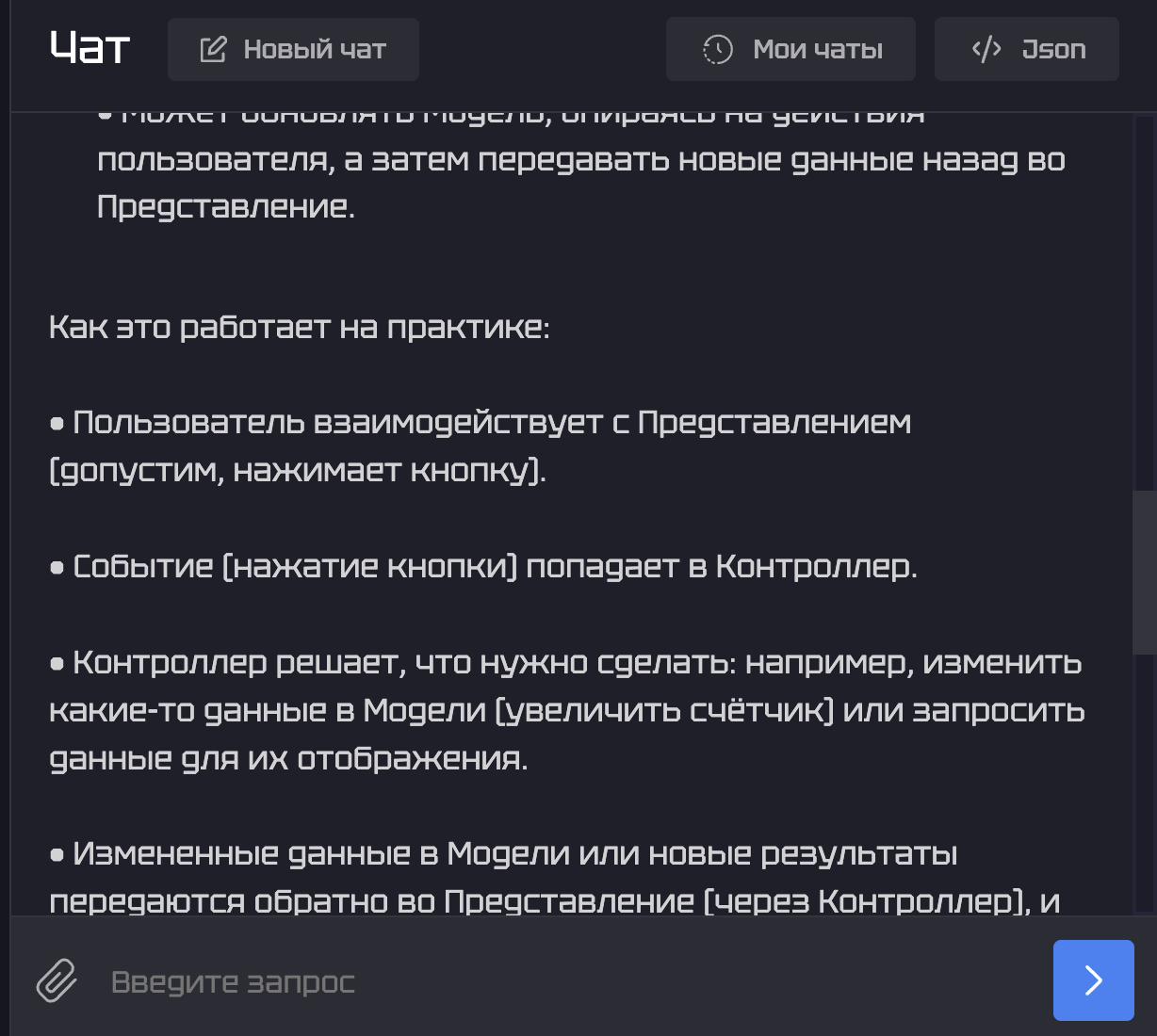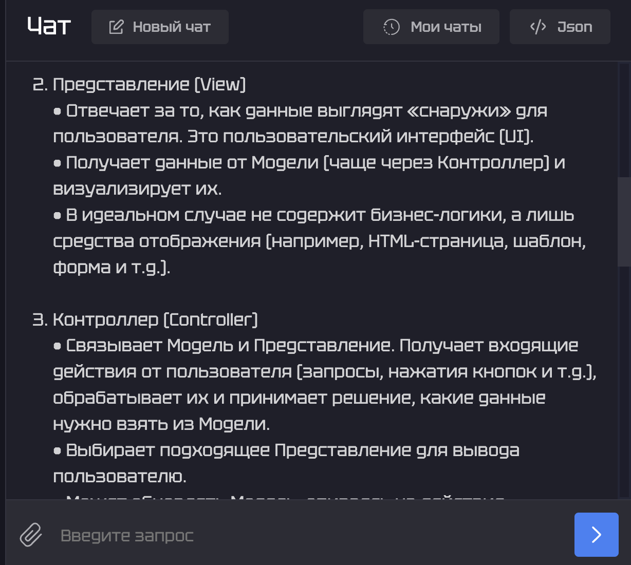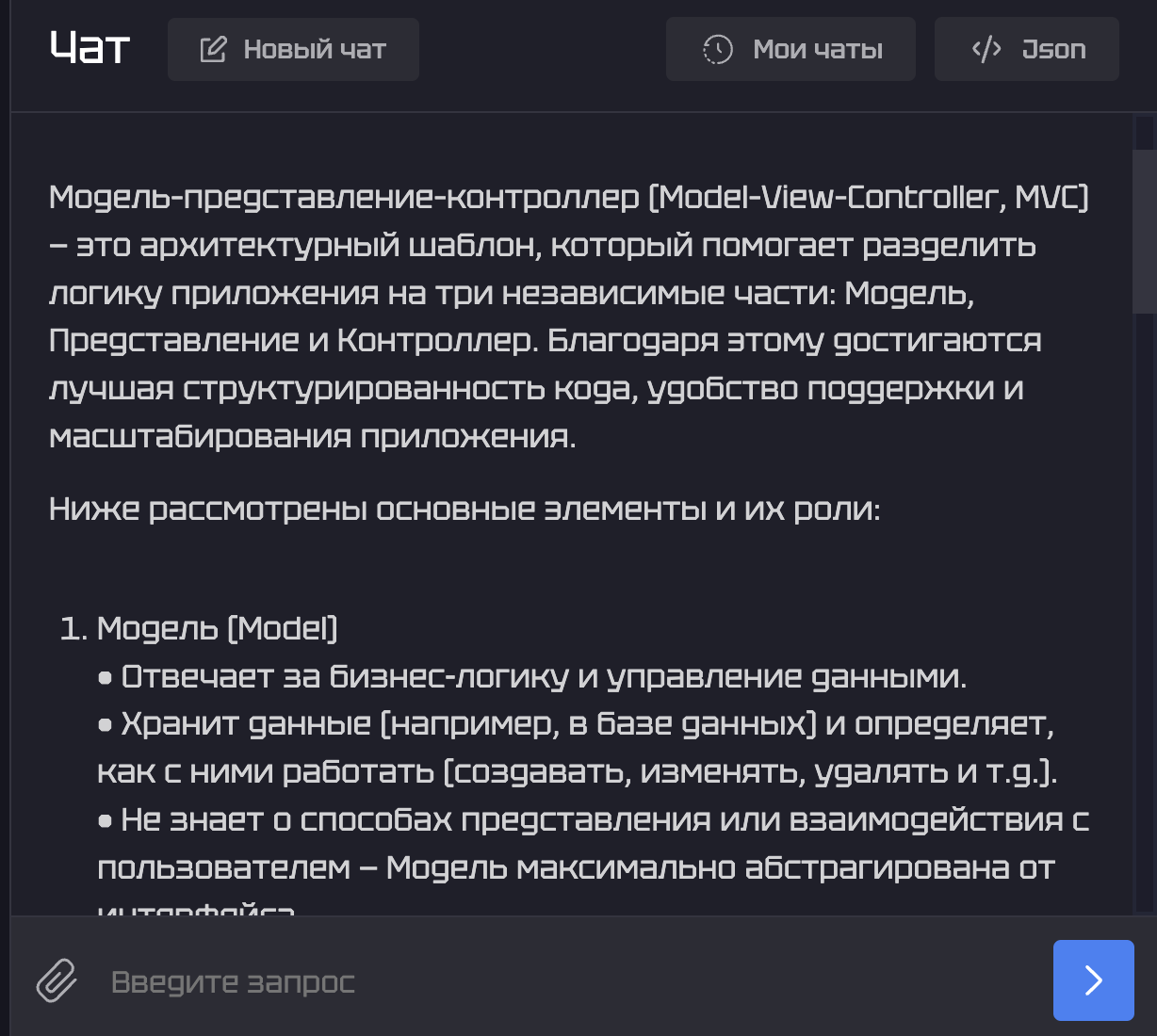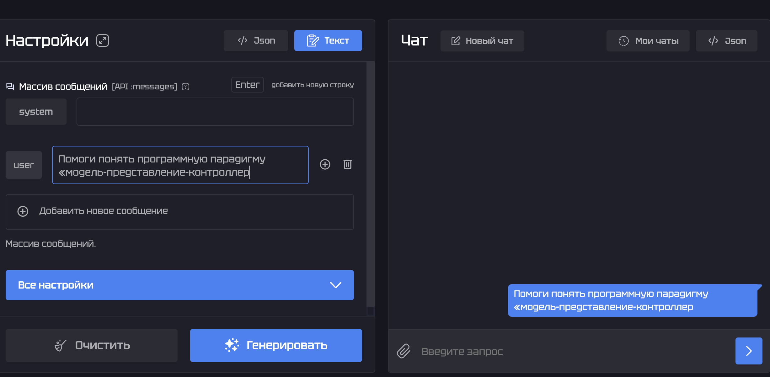 3.Чтобы получить ответ на имеющийся вопрос, нужно ввести промпт в поле «User» и нажать кнопку «Запустить». Давайте попробуем задать ИИ следующий вопрос: «Помоги понять программную парадигму «модель-представление-контроллер». После этого нужно лишь немного подождать, пока происходит процесс генерации ответа.