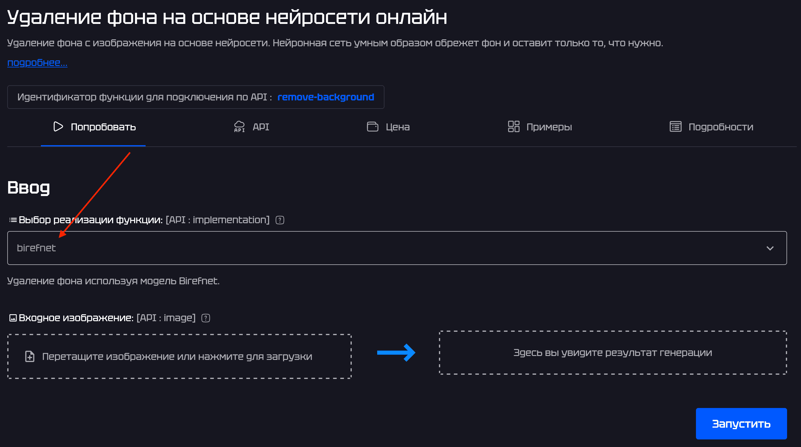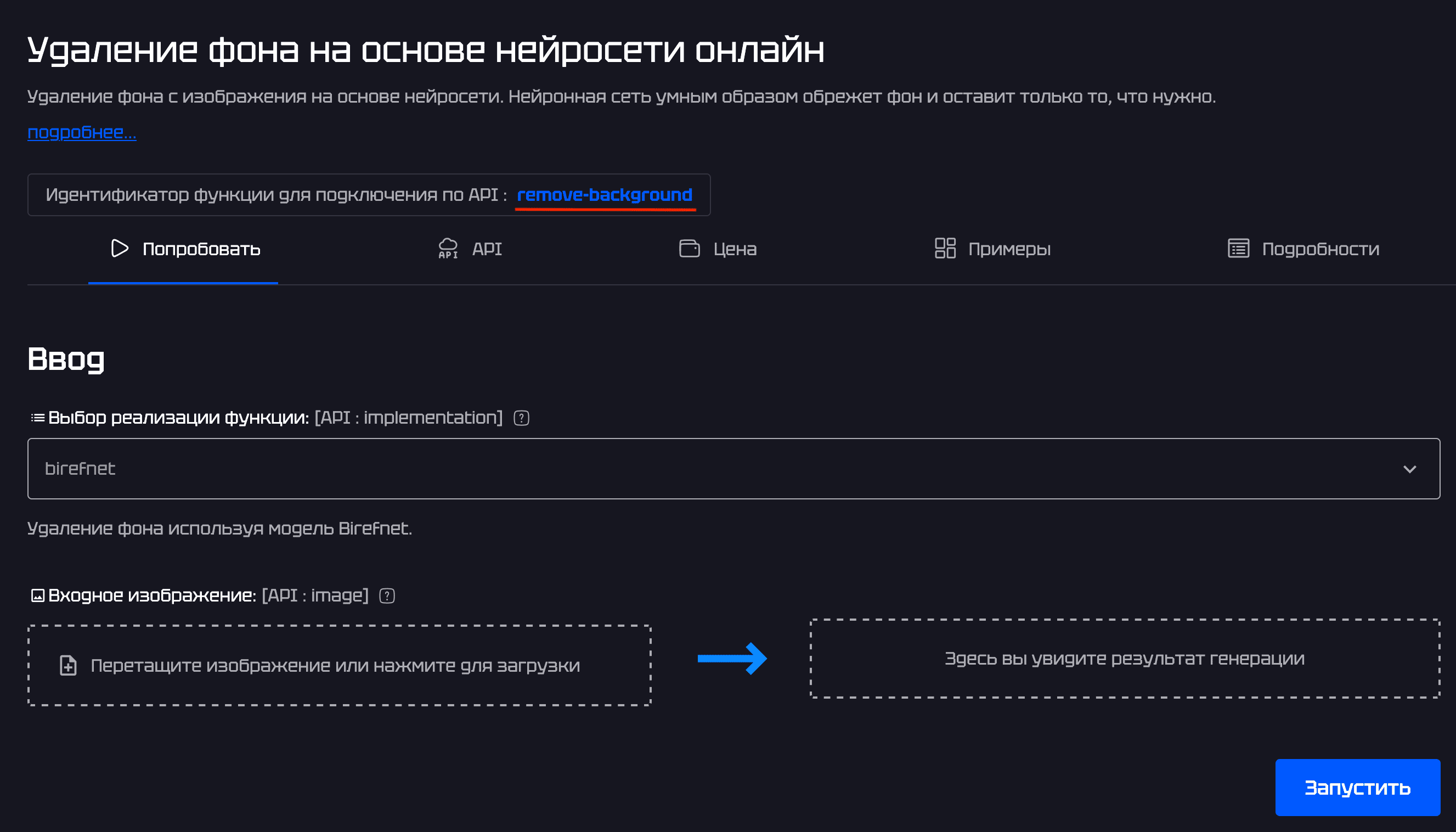 Для выполнения запроса к функции необходимо указать slug реализации, который вы получили при выборе функции, а также передать обязательные параметры, указанные на странице выбранной функции.